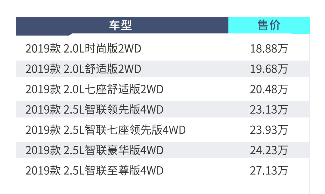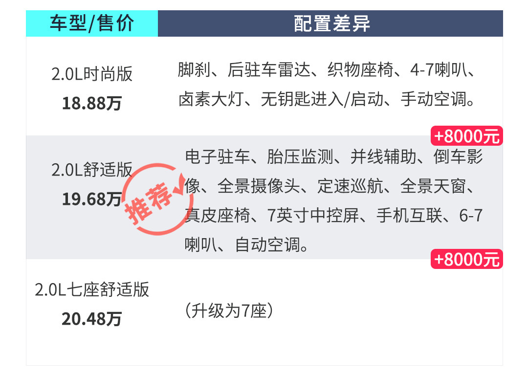 2.0L舒适版和七座舒适版增加了CTA倒车车侧预警系统、BSW变道盲区预警系统等,主动安全性能得到提升。
