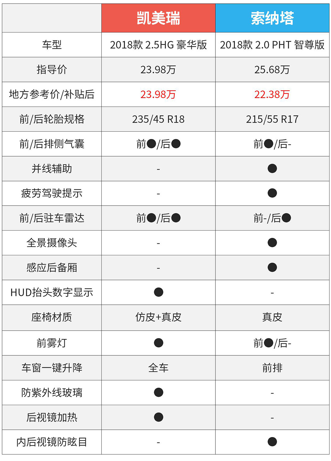 简单通过两款价格相对接近的车型做配置对比,首先基于TNGA架构下的凯美瑞在安全配置方面是极其丰富的,但由于与之对比的索纳塔是顶配车型,所以安全配置方面也几乎不分上下。不过其它配置,凯美瑞还是略有优势,毕竟也卖得更贵一点。(其中索纳塔混动,厂家给全国各地消费者相同的国补+地补共3.3万元补贴)