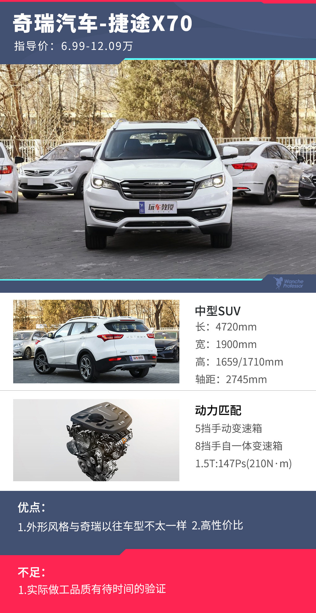 8月18日,捷途X70带着8款车型正式上市,新车售价区间为6.99万-12.09万。可能很多人还不知道捷途是个什么品牌,说白了它是一个站在巨人肩膀上的全新产品,作为奇瑞控股旗下全新的乘用车产品序列,再说简单点,它更像是奇瑞的弟弟。那这款初来乍到的车型到底值不值得买,买哪款更划算?教授一早帮你整理好了。