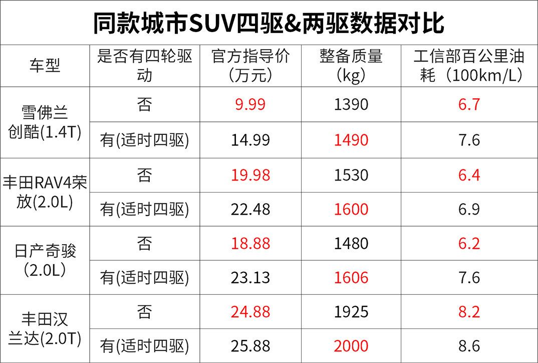 除此以外,同款车,四驱和两驱车型的价格相差也比较大,舒适性两驱却更占有优势;其次,城市SUV大部分时间都是在市区跑,最多也就是到郊区一游,四驱能发挥作用的机会非常少,但是后期维修养护成本上却要比两驱贵很多,投入与体验有些不成正比,有些划不来。