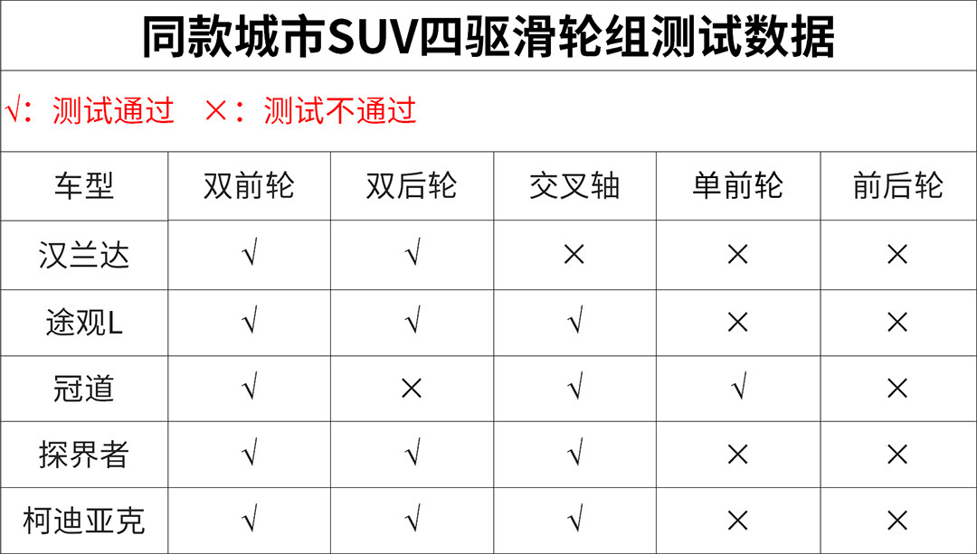 国外曾有媒体做了个四驱滑轮组测试:每辆车共测试5组,分别是前轴两轮有附着力,后轴两轮有附着力、交叉轴、单前轮有附着力、单后轮有附着力,其中前两项主要考验车辆的轴间分配能力,后三项考验车辆的轴间分配和轮间限滑能力。在开始测试之前,有四驱锁定功能的全部开启四驱锁定。经过测试对比,四驱确实要比两驱的好些,不过两者间的差别非常微小,而且在难度最大的单后轮有附着力的滑轮组测试项目里,这5款车不论四驱两驱全都没有通过。