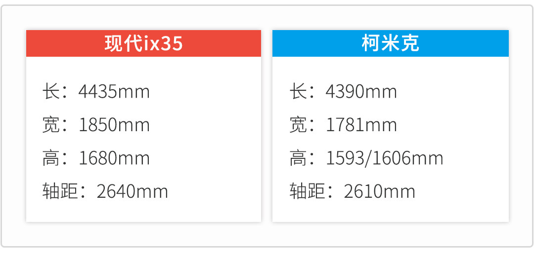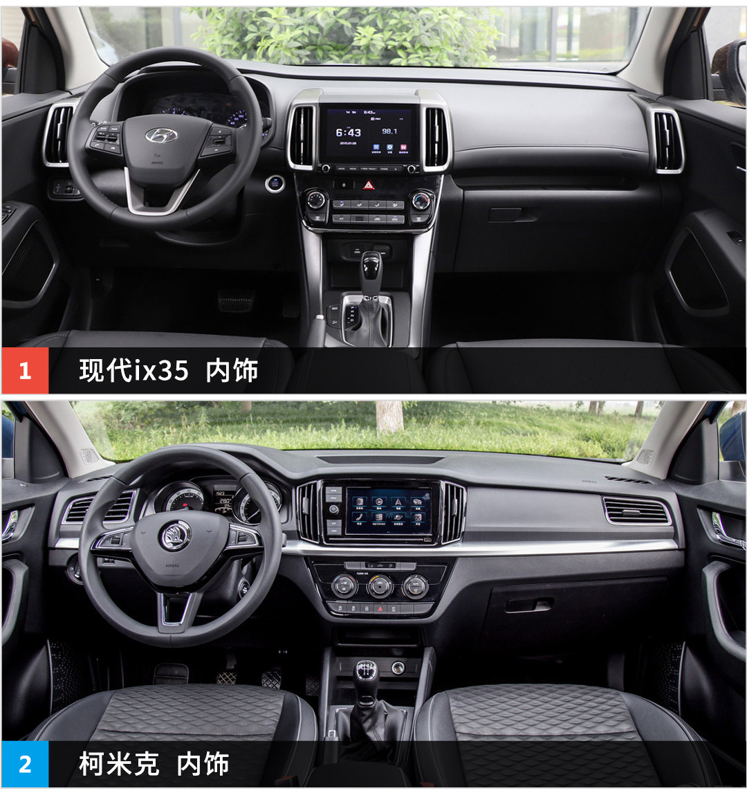 两款车的外观设计都算是优秀水平,但也都没拔尖,毕竟讲究的是性价比,成本有限,很多方面点到为止就好。而内饰方面,两车的中控区都采用对称设计,使用起来都很简单直接。柯米克的设计有不少大众车的味道,相对来说,平平无奇,没太多可圈可点的。我个人更喜欢的是ix35的内饰,延续了外观的设计风格,方正中带有圆润,非常清新自然,中控屏,按键,空调出风口,都充满层次感和立体感。