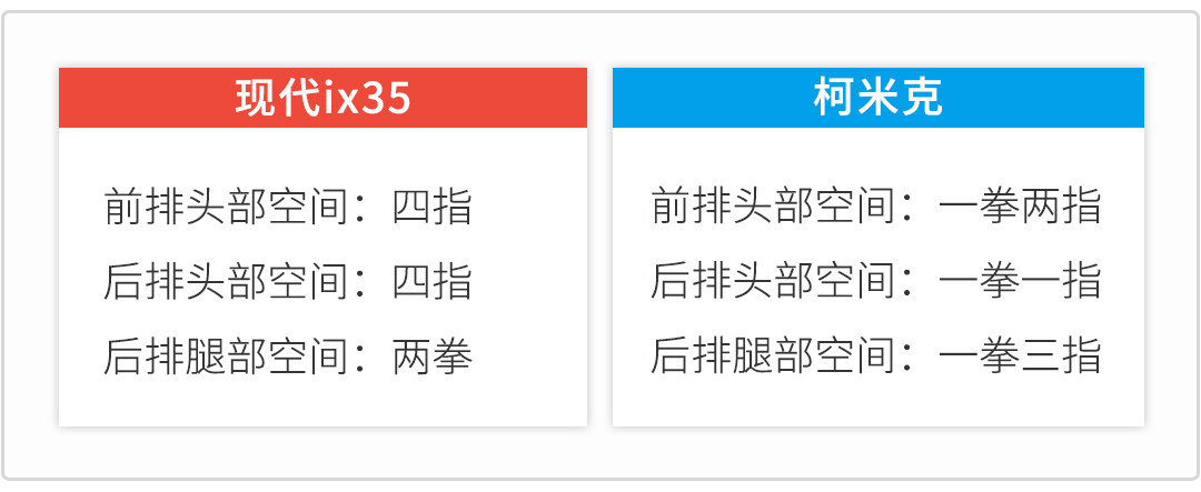 两位都是1米78的试乘员分别对两款车型做常规空间测量,测量结果也非常直观,柯米克并没有因为车身尺寸小而有失乘坐空间,相比之下,前后排头部空间都要比ix35要好,但后排腿部空间就稍微逊色点。