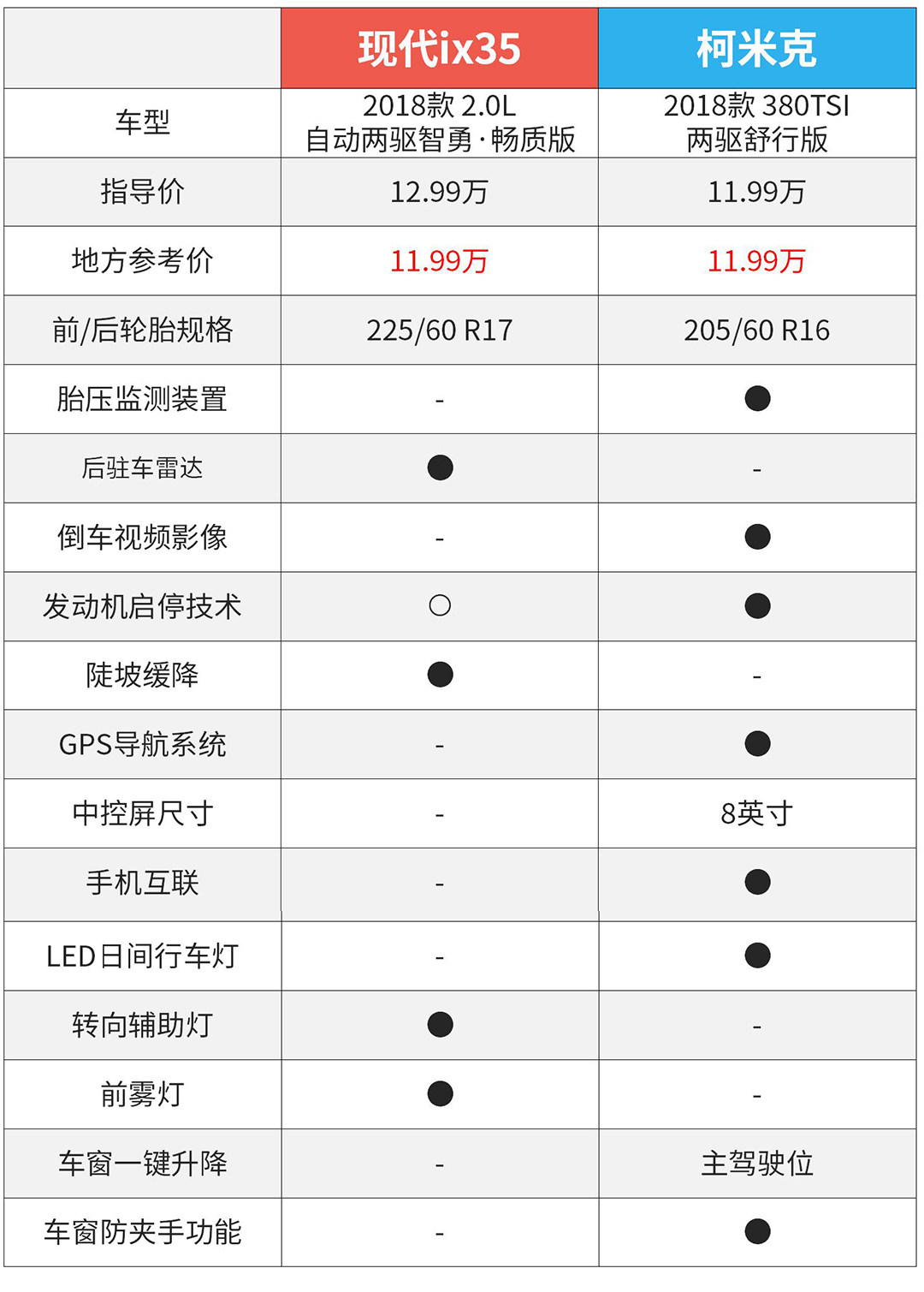 基于同价位的车型,都配备了车身稳定系统,都没有天窗,没有真皮座椅等等,剩余的配置如上表所述,相对而言,柯米克更具优势,倒车影像,中控大屏,手机互联这些如今这么主流的配置,还是柯米克做得比较到位。ix35则需要再往上选配才有。