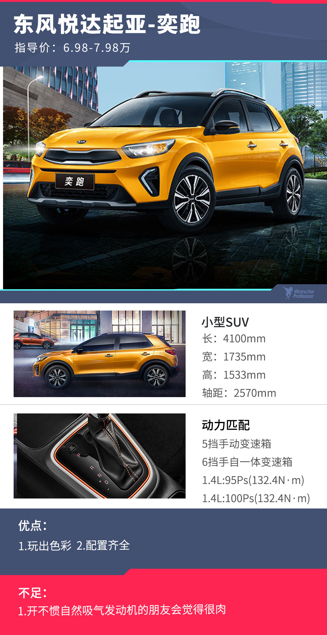 8月22日,东风悦达起亚在南京宣布奕跑正式上市,这款新车定位于小型SUV,在欧洲市场有着不错的评价,这次登陆国内,更重要的是担当起亚翻身的绝佳机会。新车共推出2款车型,售价区间为6.98-7.98万,那这款明显是迎合年轻人的SUV怎么选好?