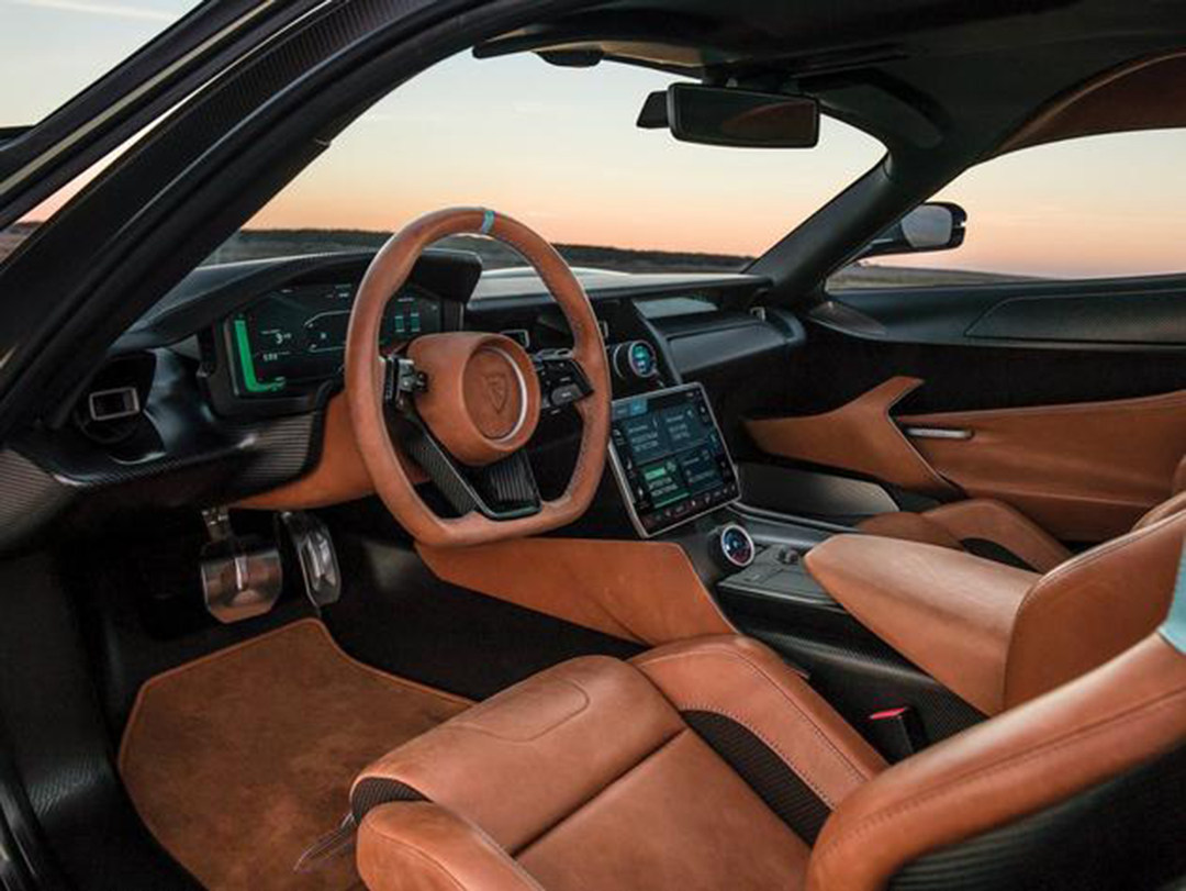 作为一辆超跑,内饰自然也是毫不含糊。整车内饰所见之处几乎均为皮质包裹,棕黑色调搭配很显档次,有着真皮包裹的碳纤维平底方向盘,运动感与豪华感同在。座舱内,全液晶仪表及大尺寸中控屏等一应俱全,透露着满满的科技感,毕竟是一台具备L4级别自动驾驶功能的电动超跑,这点科技性配置当然不在话下。你没听错,是L4级别,也就是除了不会自主学习外,它已经可以实现完全地无人自主驾驶,这在同级别当中是绝无仅有的。当然,具体疗效如何还需等全球用户们的陆续反馈。