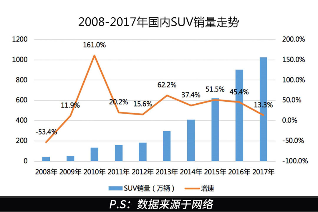 也许会有网友认为,一个月的销量下跌并不足以支撑说明什么,也有可能是因为今年新增了不少SUV车型,竞争更激烈的同时分薄了市场车型销量。但要留意一点:市场销量增长速度正在放慢!这意味着国内SUV市场已经进入饱和状态。