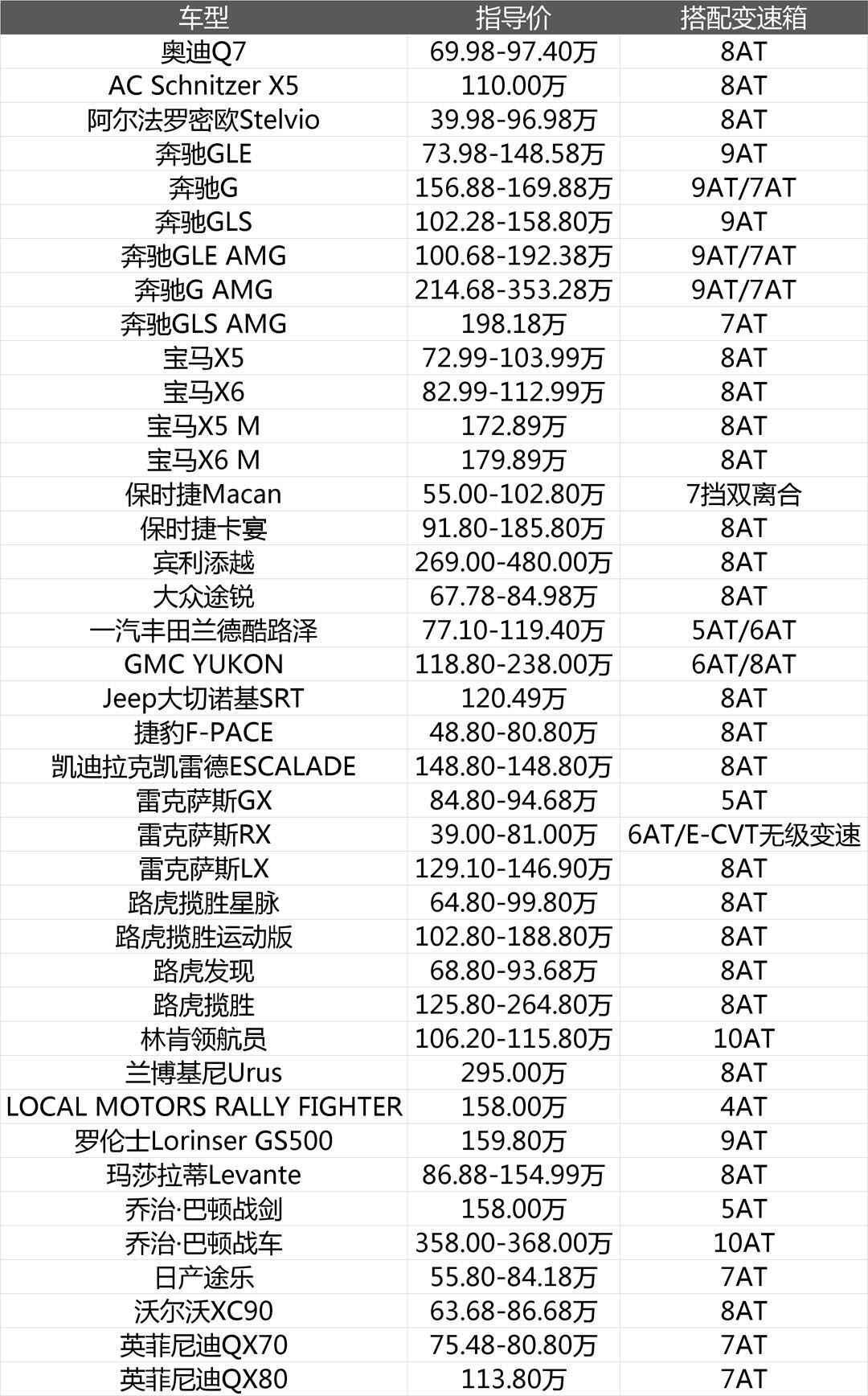 在低价位车型上,双离合和AT变速箱都是遍地开花,不过要讨论两类变速箱哪个更高级的话还得看高级车,为此教授快速整理了售价80万以上SUV车型(不包括新能源和柴油)的变速箱情况,在统计的40款SUV中仅有保时捷Macan使用双离合变速箱,其它39款车型均采用AT变速箱。可以说在高端市场上AT变速箱呈现碾压优势。