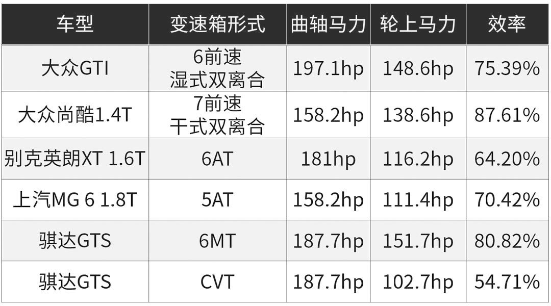 两年前,新车评网对几款使用不同类型变速箱的主流家用车进行了效率实测,通过对比曲轴马力和轮上马力的数据得出传动效率,在这个测试中搭载湿式双离合变速箱的大众GTI效率为75.39%,而搭载5前速自动变速的MG 6 1.8T为70.42%,可见在传动效率方面湿式双离合的优势并不大。