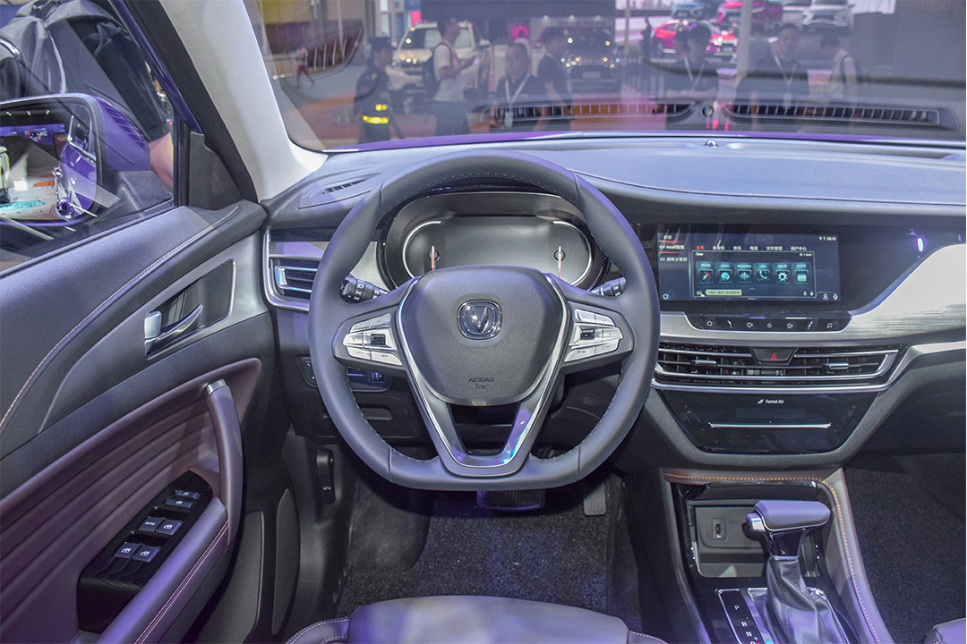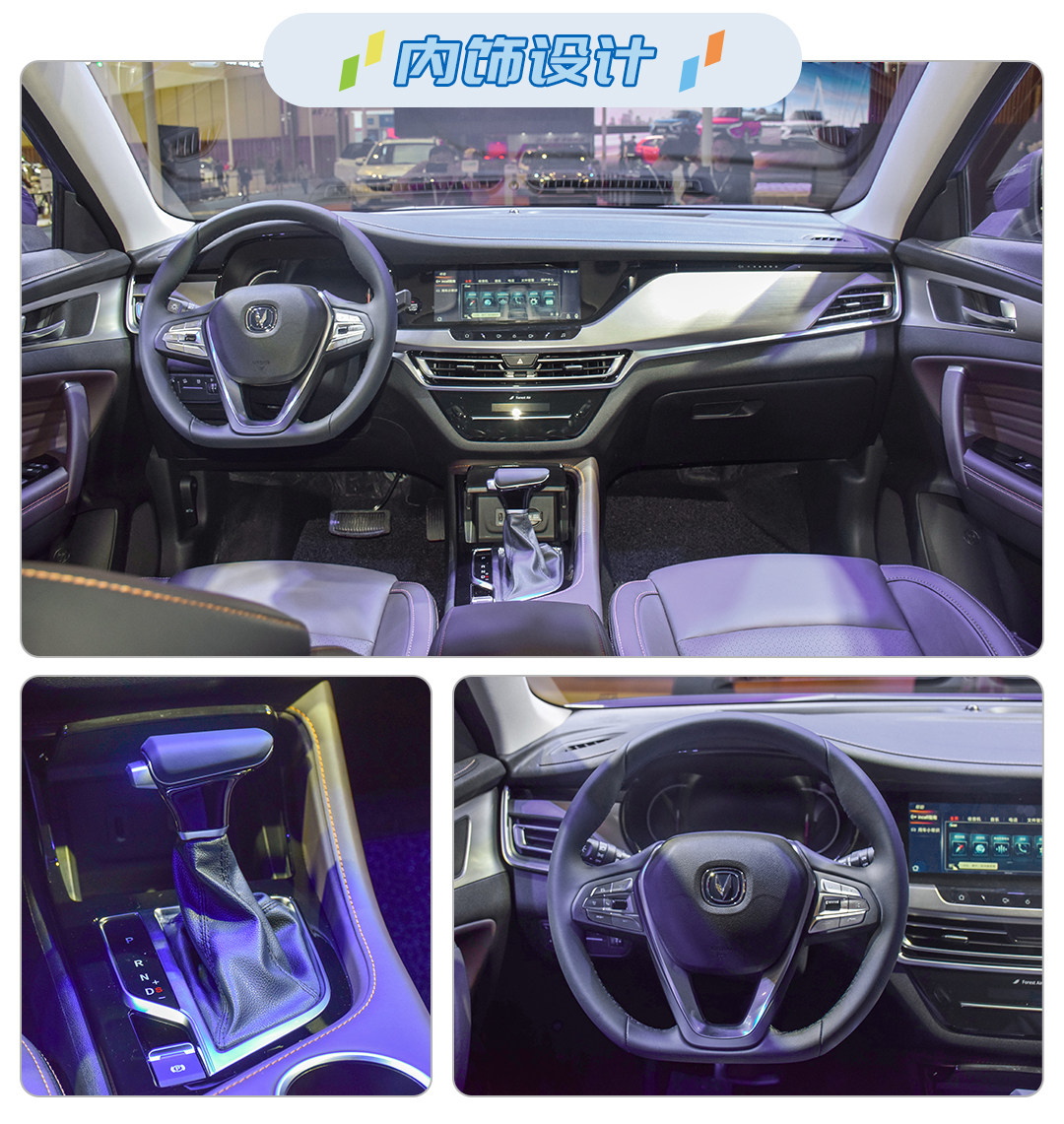 内饰方面,可以看到既惊喜有熟悉的变化,可以看到内饰是用上了长安家族式的设计,和睿骋CC、逸动的内饰设计是一样的;中控面板是用上了很舒展的面板,中控屏是嵌入式的,下方式空调控制区,是触控控制的,上下层次也很清晰,可以看到有皮革装饰,档次上升了不少。