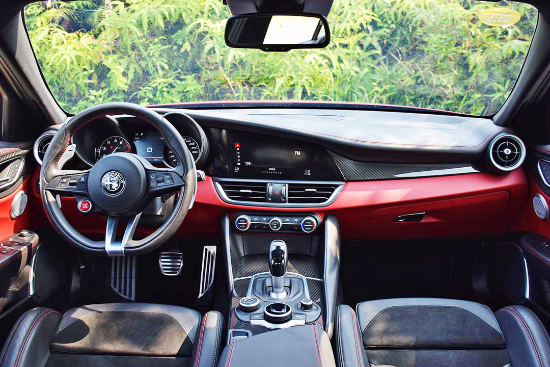 内饰造型具有设计感,用料也不错,而且主打性能的四叶草版车型还加入了许多碳纤维元素,提升运动气息。动力方面,阿尔法·罗密欧Giulia根据车型不同搭载两款不同调校的2.0T发动机,而四叶草版车型则搭载2.9T V6发动机,匹配8AT变速箱。