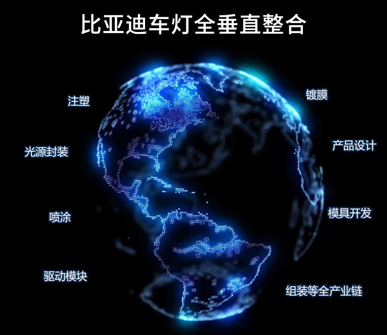 比亚迪第六事业部总经理陈刚就给出了答案,不同于奥迪等其他车厂更多是通过外部供应商的资源来实现他们对车灯的概念,比亚迪是全球率先实现车灯全垂直整合的车企。从LED光源、芯片、封装、驱动模块,包括透镜光学单元,比亚迪有自己的注塑、镀膜等工艺,全部整合完后,成本自然得到了控制。
