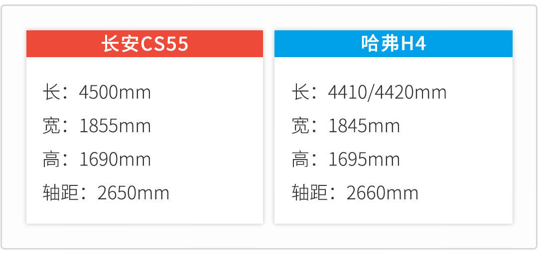 两款车的定位都是紧凑型的SUV,但是尺寸要比很多紧凑型的SUV小一些。从尺寸上看,长安CS55在车身长度上占有绝对优势,H4的红标车型要比蓝标车型长10mm,而在宽度、高度和轴距上两者比较的接近。