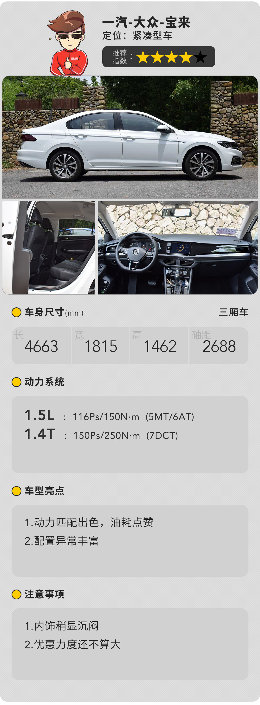 针对口碑上的缺失,宝来迎来一次最终大的升级。平台换成MQB平台,轴距增长,外观更新使得更加年轻,再配上“黄金动力组合”。这样的产品很大众,也正因为“大众”,才能热销。目前初期来看宝来开了不错的头,性价比也略优于新朗逸。