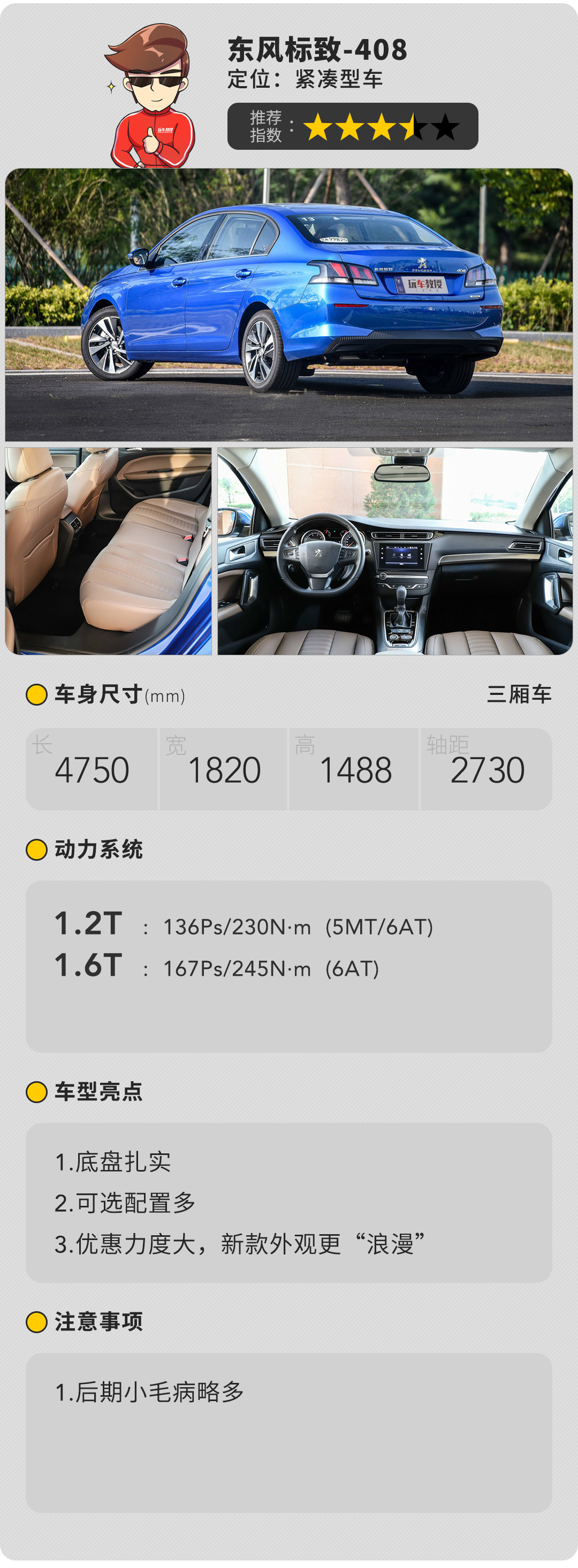 经过几次的换代改款之后的408上市后就立刻吸引了众多消费者的目光,以其优良的品质、不错的优惠幅度获得了不俗的销量,虽然与德系、日系竞争对手仍有差距。新款408目前已经上市,更加前卫的外观与实用的配置,有意购买入门级紧凑型车的朋友们真的不妨了解一下。