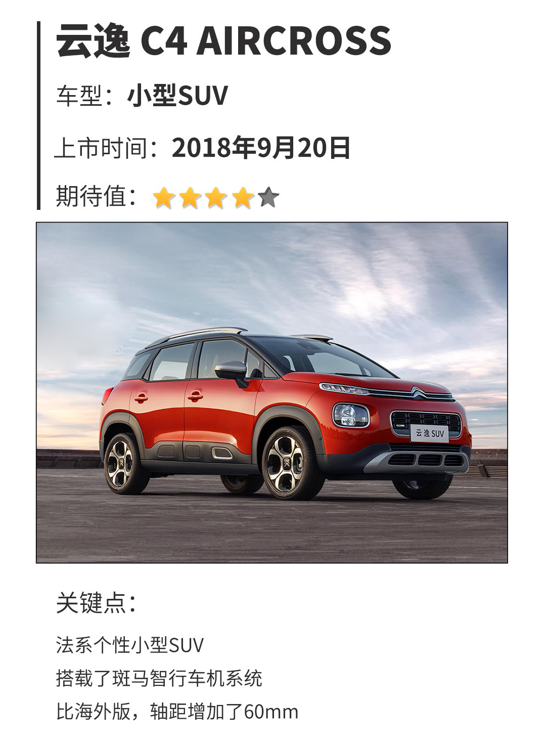 东风雪铁龙-云逸 C4 AIRCROSS车型将在9月20日正式公布价格并上市销售。云逸实际上是海外版本C3 Aircross的国内加长版本,个性化设计是该款车型在外观方面的最大特点。搭载了斑马智行车机系统,能更好地满足年轻人对互联网的需求;尺寸方面,相比海外C3 AIRCROSS车型,车身长度增加了115mm,。1.2T和1.6T的两款涡轮增压发动机是为PSA集团的王牌动力,在这款定位入门的SUV上并没有缺席。新车推出后,可进一步丰富个性化SUV市场的选择。能见到如此具有个性的车型是一件喜闻乐见的事,但是个性终究不属于主流,云逸 C4 AIRCROSS估计也就是少数消费者的选择。