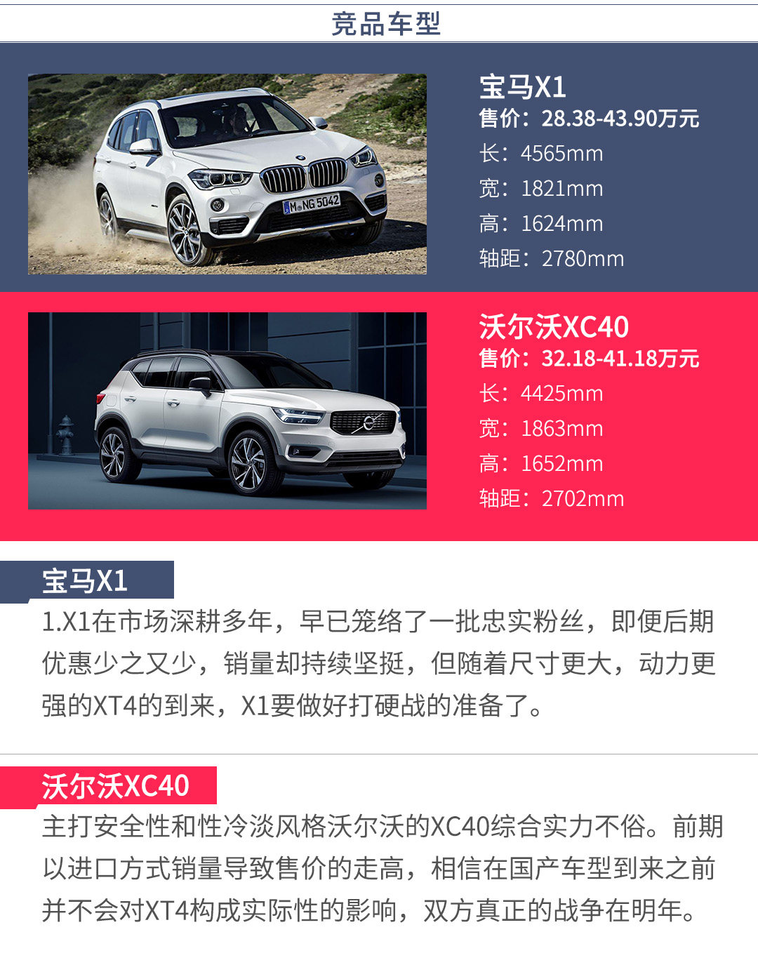 在国内豪华紧凑型SUV市场一直被BBA三强(GLA、X1、Q3)把持,市场上可选车型偏少是主因,BBA强大的品牌影响力是诱因。诱人的市场红利岂会不令车企心动,一众二线豪华品牌早已蠢蠢欲动,双方的战争一触即发。而2018年将成为这场”战役“的关键节点。沃尔沃XC40、捷豹E-Pace、凯迪拉克XT4等重磅车型的问世,将会对BBA三强发起最强而有力的挑战,其中尤以凯迪拉克XT4胜算最大。