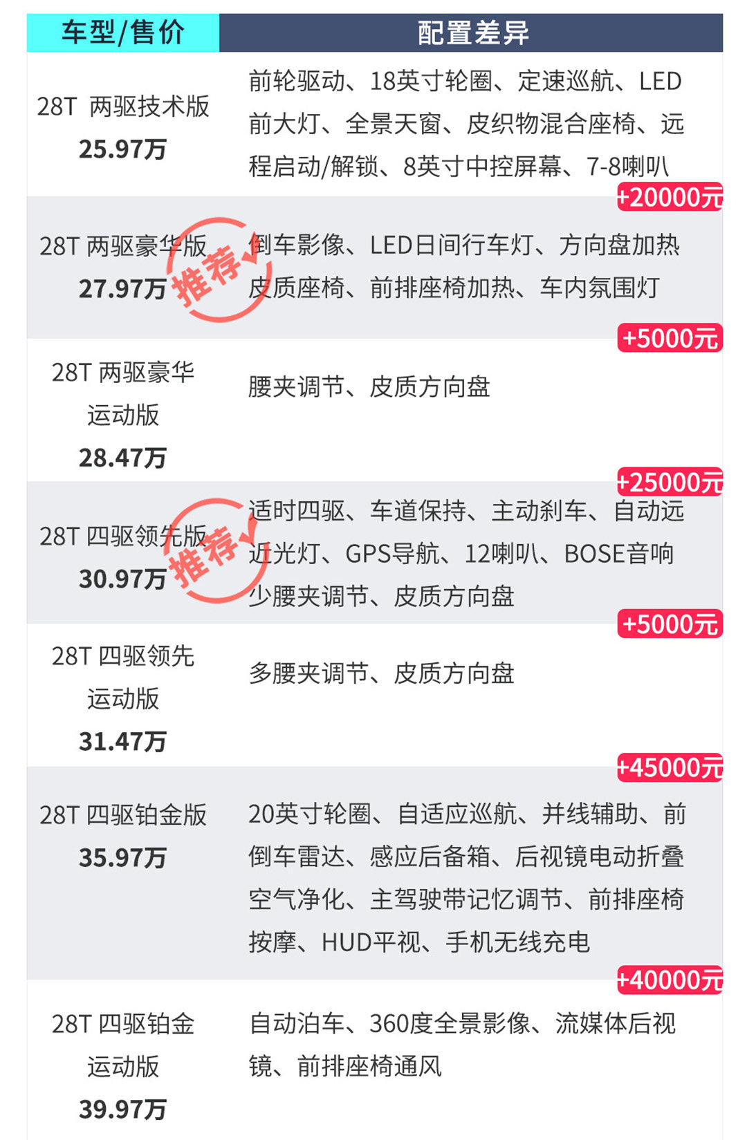 四驱系统对于SUV重要不言而喻,音质细腻的BOSE紧闭车窗开启音乐真的不亚于一场小型音乐会,车道保持和主动刹车又增强了行驶时的安全性,这30万花得还是挺值当的。多花5万或9万购买次顶配和顶配车型,只是多了更多高逼格的配置,性价比真心不高。