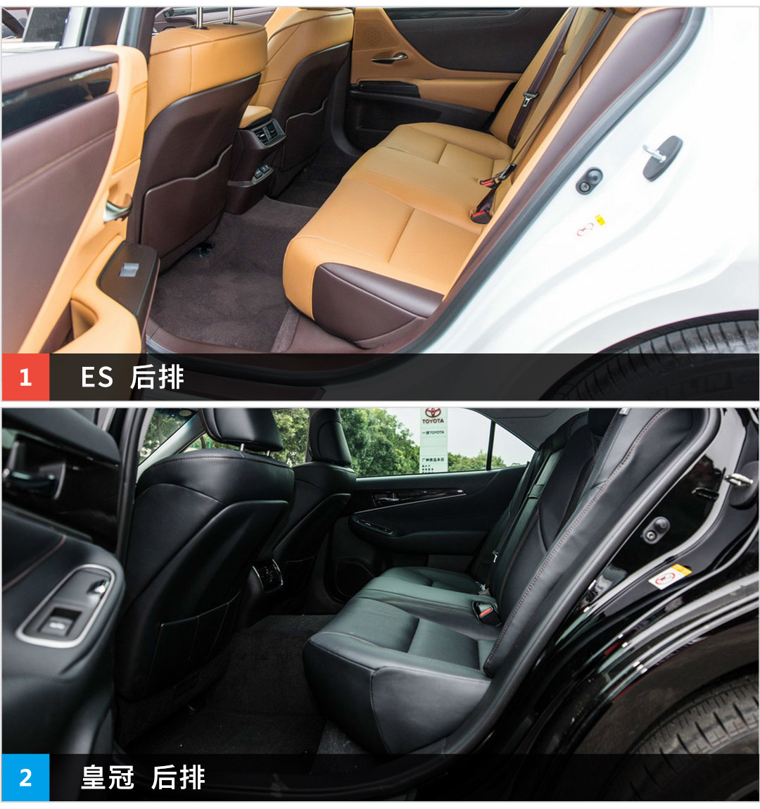 从表格尺寸上看ES虽然不那么占优势,但后排空间非常宽敞,翘二郎腿更是小事一桩。不过头部稍有局促,为了“溜背”也只能牺牲这些空间了,而且由于车身降低,中间有一定隆起;皇冠看数据都知道明显注重后排的体验,更强的轴距使得乘坐感受一流,再加上后排座椅的包裹性很强,“老板位”不是浪得虚名。唯一有点不妥的应该就是中间那巨大的隆起,没办法,谁让它是后驱车。