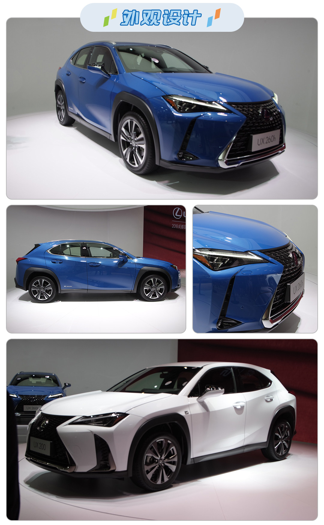 外观上,UX的前脸使用家族式的纺锤体造型中网,从上贯穿到下,再加上凌厉的日间行车灯,构成了雷克萨斯现时的设计语言,由于全进口的原因,雷克萨斯并不会像大众T-EOC一样加长,所以导致后排空间不被人看好。雷克萨斯UX也是首款贯穿式尾灯的雷克萨斯,并且立体感相当强,下方使用黑色塑料包裹,让整辆车的运动感觉很强。