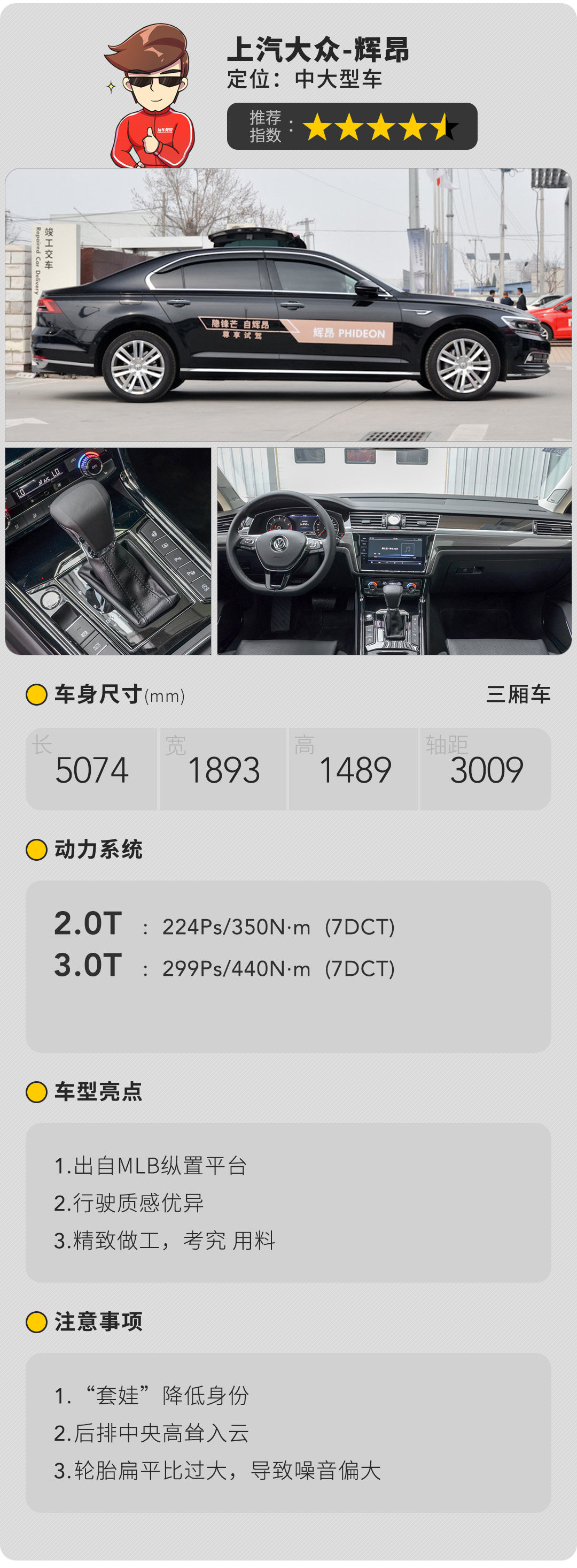 内饰在千篇一律的大众格调下暗藏出众的用料和做工,精选来自欧洲百年的橄榄木、欧洲小牛皮。Nappa真皮座椅、车载冰箱、丹拿音响、木质小桌椅等配置基本上是打遍同级无敌手。底盘调校是典型的大众质感之流,扎实又不失舒适。将路面上各种的消息完美隔绝于乘坐舱外。