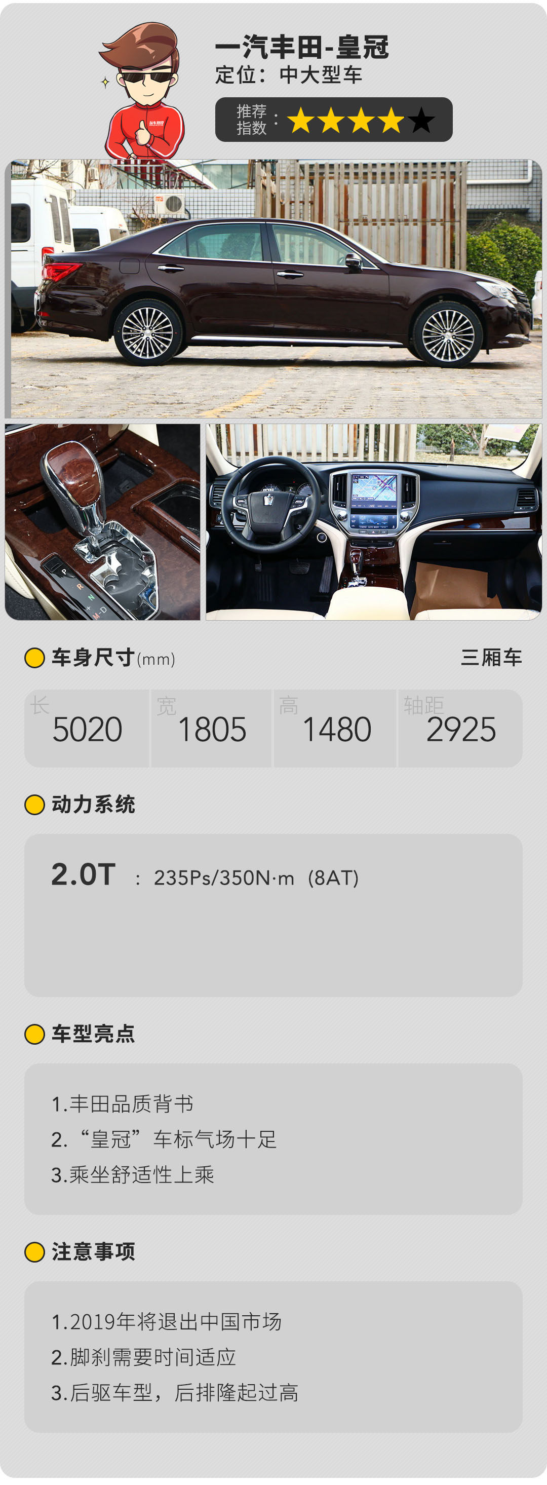 外观突如其来的年轻化风格与历代车道背道而驰,沉下心来仔细端详那种气定神闲的气场尤在。前双叉杆与后多连杆独立悬挂的加持下,营造出日系车型少有的行车质感同时延续了皇冠优越的乘坐舒适感,存在感几乎为0的机械部分和柔软的沙发座椅。同级别中舒适度的佼佼者。官方已经证实明年将要停产的消息,所以要买就趁早了,过了这个村就没了这个店。