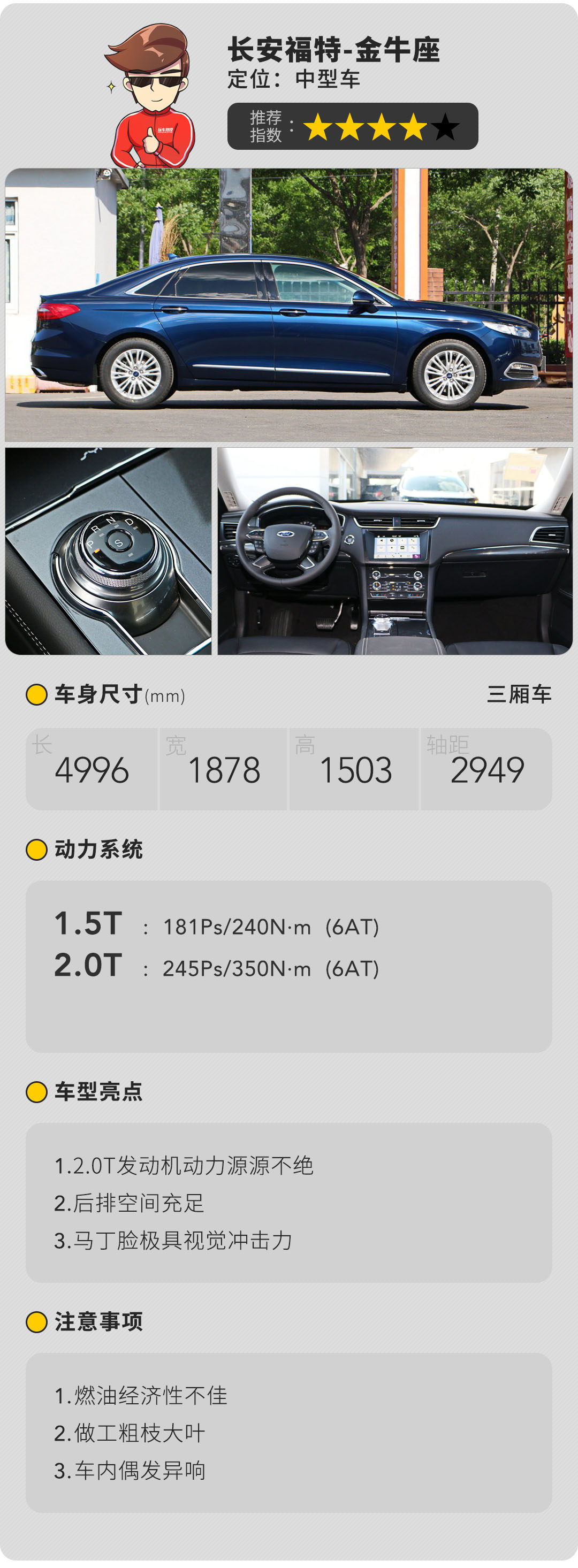内饰与如今主流的看得见的豪华的相比,福特更崇尚于摸得着的豪华,即便是最入门车型手触之处皆以触感细腻的真皮或搪塑材料进行包裹。全系标配膝部气囊、全景天窗、自动驻车等配置在同级别中尤为难得,而高配车型右后老板座几乎集齐了所有市面上的舒适性配置。老旧的6AT变速箱虽说廉颇老矣,却尚能否。遗憾的是碍于排放法规,2.7T V6车型已经离我们远去。