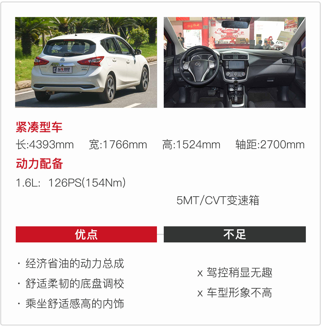 骐达全系搭载了型号为HR16的1.6L发动机,匹配CVT变速箱,这套组合成熟可靠,且综合油耗比较的低,非常适合家用。相比其它四款车型,骐达的指导价要高一些,但有着不错的优惠幅度,还是值得购买的。