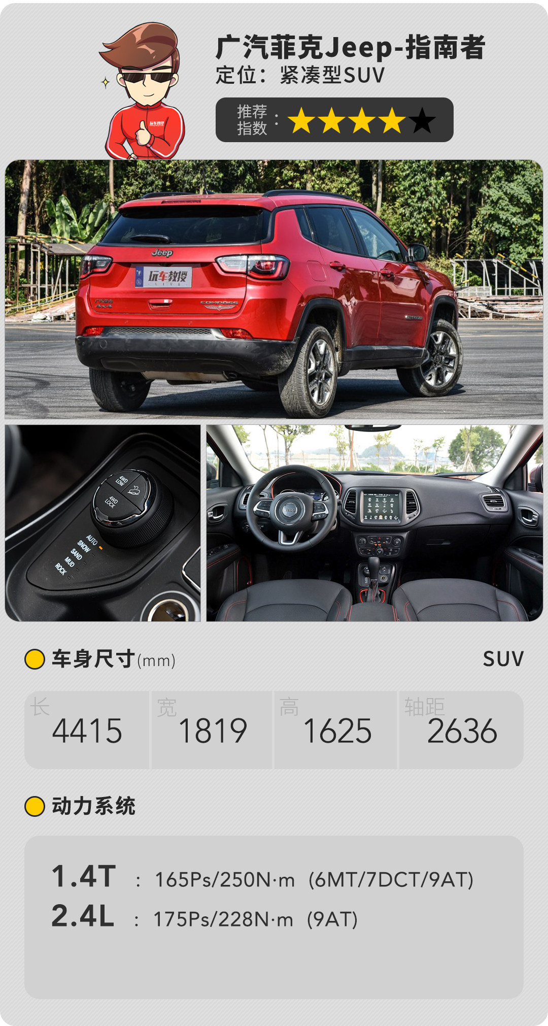 现款指南者的外形简直就是大切诺基的翻版,尤其前脸设计,第一眼看过去还得想想这是大切诺基还是指南者。既然要越野,买1.4T车型肯定不行,2.4L版本才是指南者的“本体”。与普通版车型不一样,2.4L版本使用了更大的前保护杠,同时悬架也更高了,搭载Jeep Active Drive Low智能四驱系统,拥有5种越野模式的选择,让阁下无需有任何顾虑,尽情撒野。