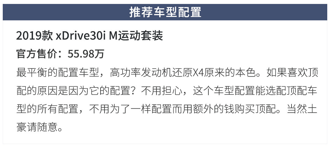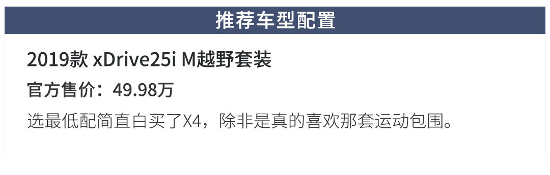新一代宝马X4已经从以前的硬派猛汉,成了现在的居家温柔男士。当然尽管X4向舒适性作出了很多的妥协,不可否认的是X4还是有很强的运动底子,这一点教授必须赞许保持自我这点。不同与X3,对于如此个性的一款跨界SUV来说,教授推荐给那些懂家庭、懂生活的男士们,只有他们才会懂X4的存在价值与乐趣。