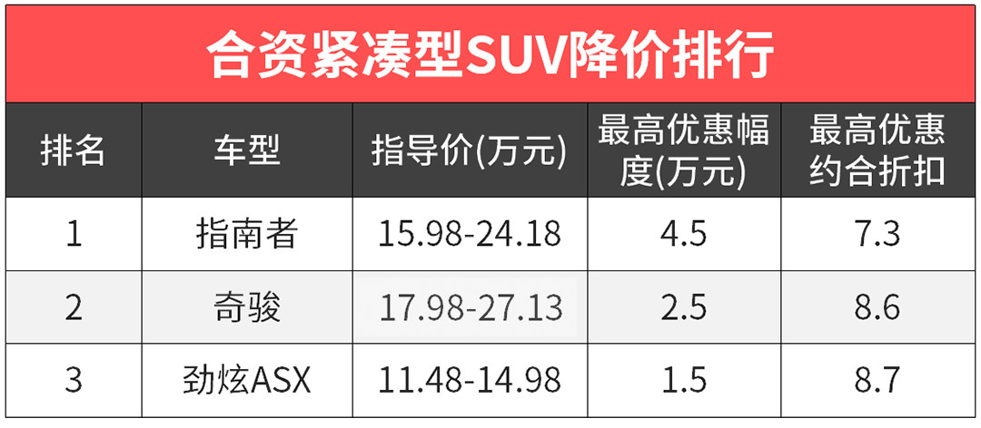 目前合资紧凑型SUV的购车热度其实是不如自主品牌的,在紧凑型SUV这个细分市场,自主品牌几乎是占据了半壁江山,但其实那些主流的自主品牌SUV也不算便宜,也没有太多优惠幅度,只是在金融政策方面还一些不错的选择。至于买合资还是买自主也并非我们今天要讨论的问题,所以还是看看合资SUV减价如何?