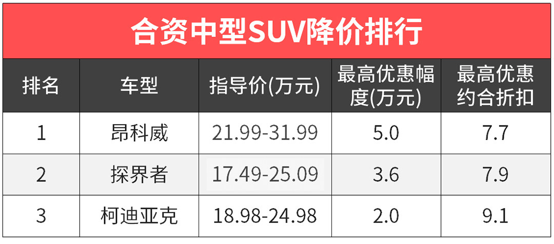 在中型SUV这个细分市场,优惠较大的基本都是偏中低端的车型,昂科威和探界者的门槛价都相比较低,而偏向中高端的车型,比如汉兰达,冠道等车型,虽然也有优惠,但是幅度不大。