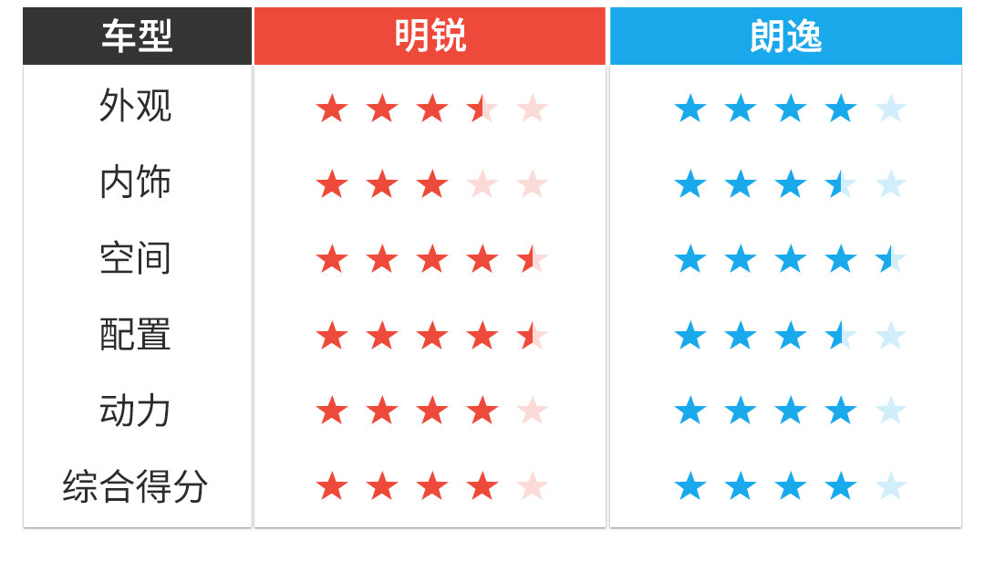 两车基于同平台,动力水平是一样,空间也相差无几,但明锐的行李厢会实用许多,外观内饰,朗逸稍占优势。但配置方面,由于目前明锐的优惠幅度更大,所以同价位的情况下,明锐的配置会更丰富。所以综合而言,两车应该是平分秋色的,但是外观毕竟都是因人而已,但性价比方面,明锐则是实打实的优势。