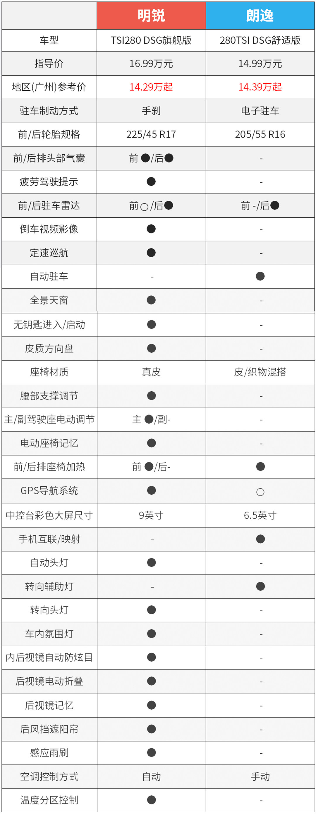 由于两车目前的优惠状况不一致,所以我们以广州地区的优惠幅度为参考,对比两车的1.4T优惠过后的配置,其配置差异如下表所示。