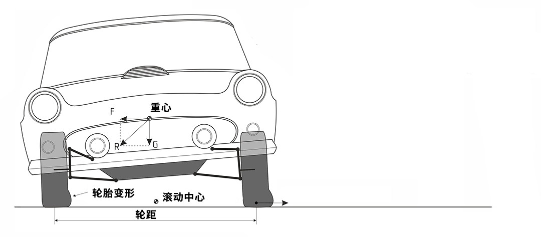 汽车转弯时都会围绕一个滚动重心来转动,滚动中心和悬挂的设计有关。现在绝大部分的汽车都是重心在上,滚动中心在下。重心和滚动重心之间的距离一般决定了翻滚力矩的大小。翻滚力矩越大,车辆侧倾的趋势就越大。一般而言,滚动重心和重心重合,车辆并没有滚动力矩,因此滚动趋势为0,车身不会有任何侧倾。