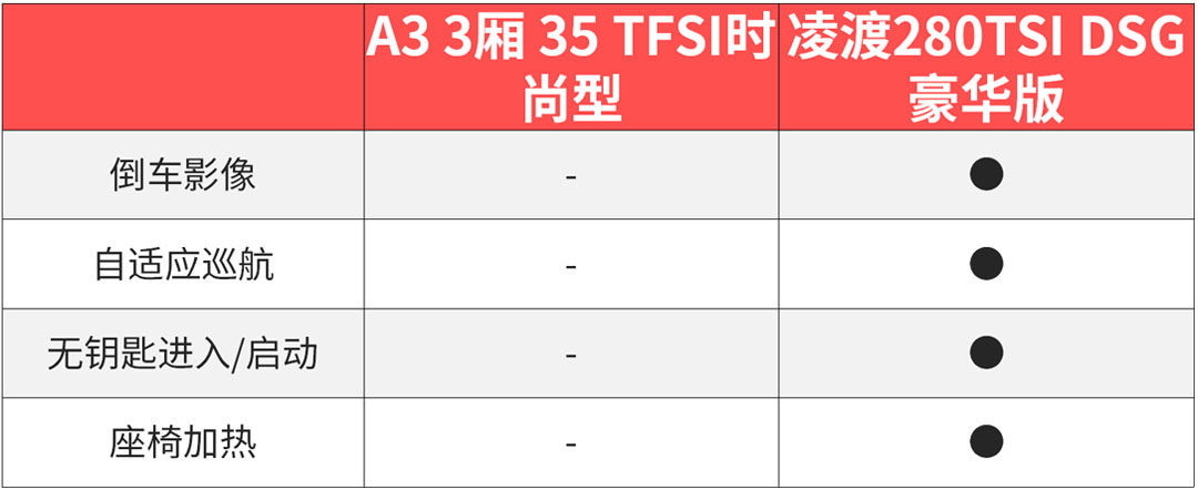 凌渡虽然豪华感不及奥迪A3,不过在配置上要比A3吸引人。在价格接近的的情况下,凌渡比A3多出了倒车影像、自适应巡航、无钥匙进入/启动、座椅加热等实用性功能。如果对配置看得很重的人自然会选择凌渡。