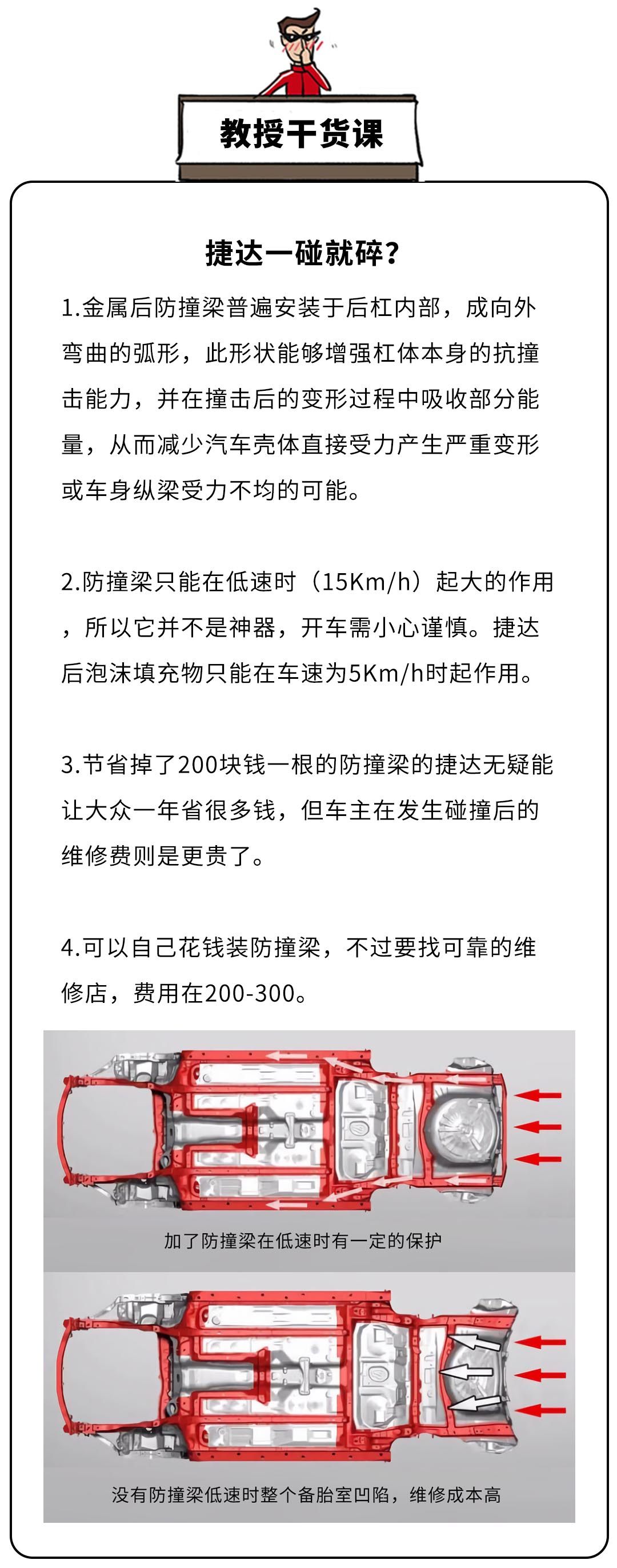 虽然多人买,但并不存在没有槽点,平台老旧是一个地方,但吐槽力度不强,没有后防撞梁才是核弹级的打击。开在路上总能收到异样的眼光,“哎,这车没有防撞梁吧,那岂不是一碰就碎,没钱也不要买这种车呀”。捷达没有防撞梁,碰撞时维修成本会高点,但是你可以跟吐槽的人说:劳资自己加了防撞梁,防撞梁不是神器,高速碰撞大家都一个样,嘿嘿。