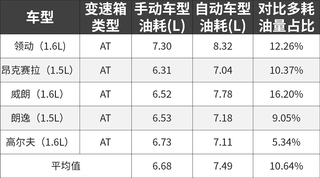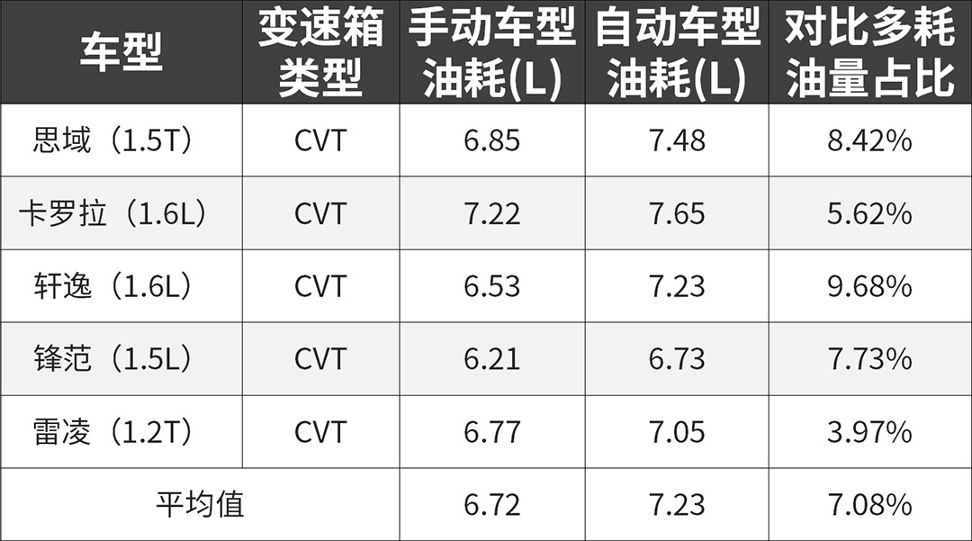 另外,从教授列举的车型看,卡罗拉和雷凌的表现是最优秀的,这两款车型相比各自手动手动挡车型多消耗的油量不足6%,加上其本身车辆油耗就很低,所以如果想买辆节油的家用车,卡罗拉和雷凌都值得考虑。