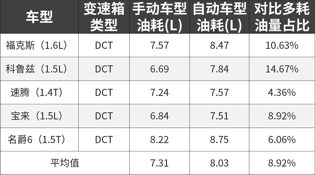 不过,在众多采用双离合的车型中,油耗表现最出色的还得是大众的DSG变速箱,细看上述的数据表我们不难发现大众宝来、速腾的自动挡和手动挡间的油耗差距还是比较小的,甚至超过了很多CVT,从这方面来看,也说明了大众在DCT变速箱研发上占有绝对的领导优势。