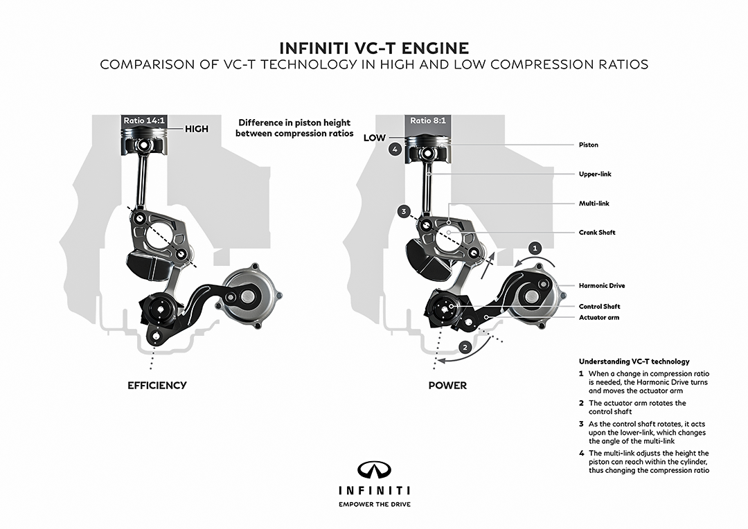 据官方介绍,该款VC-T发动机的可变压缩比技术压缩指压缩比能在8:1-14:1间自由调节,使发动机在低负荷时选用高压缩比,旨在降低油耗;高负荷时调节至适应高增压值的低压缩比,带来高效输出。可变压缩比技术还能缩短冷启动、暖机过程,降低有害物排放量。