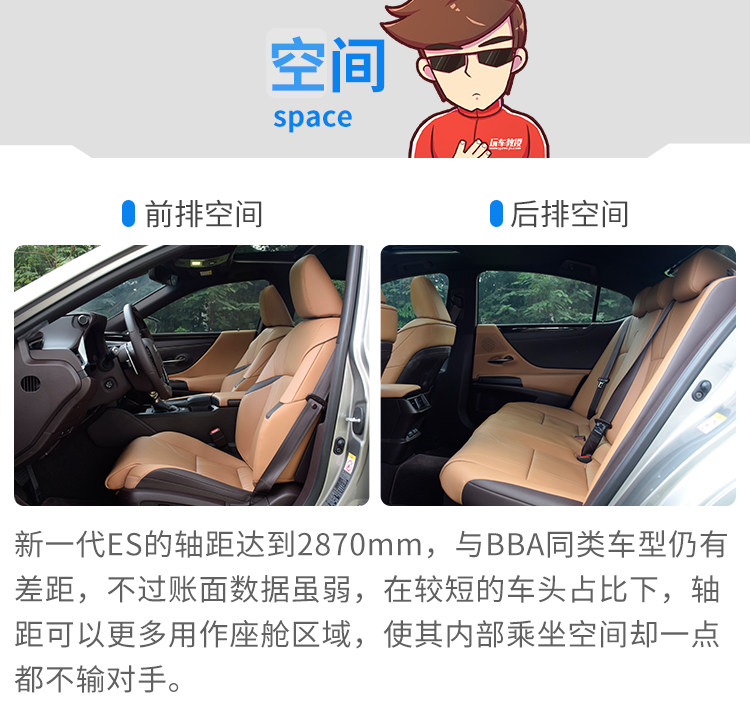雷克萨斯在新一代ES身上进行的外观改造显然是相当成功的,新车完全摆脱了此前偏老气的设计风格,更大更细致的纺锤形中网和更加具有攻击性的大灯造型和凌厉的腰线都让新一代ES散发出一种运动气息。不过在车身尺寸方面,雷克萨斯ES一如既往地稍落后于欧洲对手,不过由于ES采用的是前置前驱布局,且不提供体积更大的6缸发动机,车头占比较奔驰E级、宝马5系及奥迪A6更小,其2870mm的轴距更多用在了构筑乘坐空间上面,因此车内空间表现是完全不输对手的。