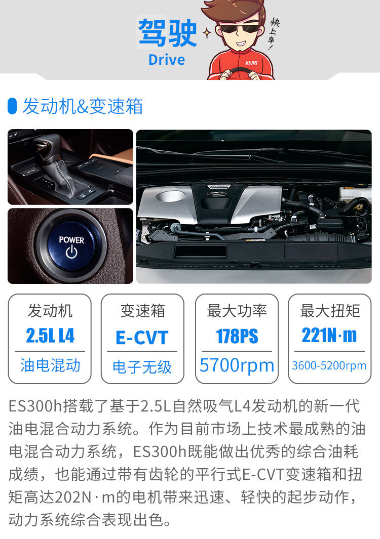 全新的平行式E-CVT变速箱加入了齿轮组传动机构,在起步阶段发挥了非常重要的作用,使得这款ES300h 尊享版起步相应非常迅速。