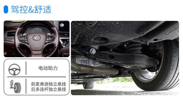 新一代雷克萨斯ES依旧采用前麦弗逊后多连杆的独立悬挂设计,底盘调校稍偏向于舒适性,但是在弯道中车身也没有出现大幅度倾侧;方向盘虽然路感不算清晰,但好在指向性非常清晰,没有明显虚位,且反馈力度适中,驾驶起来不易感觉疲劳。总的来说,新一代雷克萨斯ES可以提供不错的驾驶乐趣,同时乘坐舒适性表现也比较出色,两者兼顾,但都不拔尖。