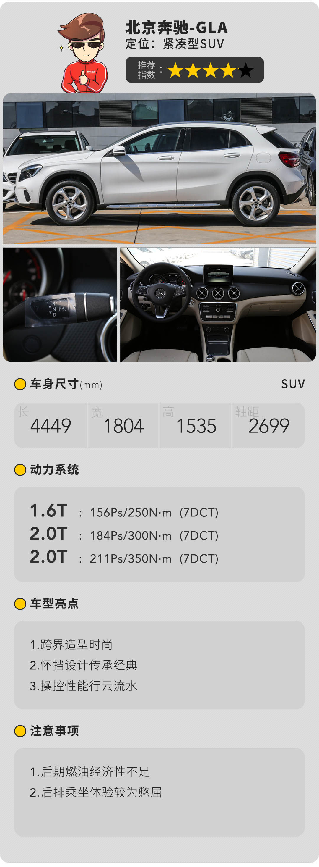 进口身份带来的高昂售价与居高不下的后市场使用成本、特立独行的跨界造型引致的狭小二排空间、7速双离合频发的不安顿挫与奔驰高级的行车质感大相径庭,种种的一切令GLA在上市初期遭遇了滑铁卢,可随着国产车型的到来,运动元素慢慢走红,7速双离合不断进化。街上的能见度逐渐增高。