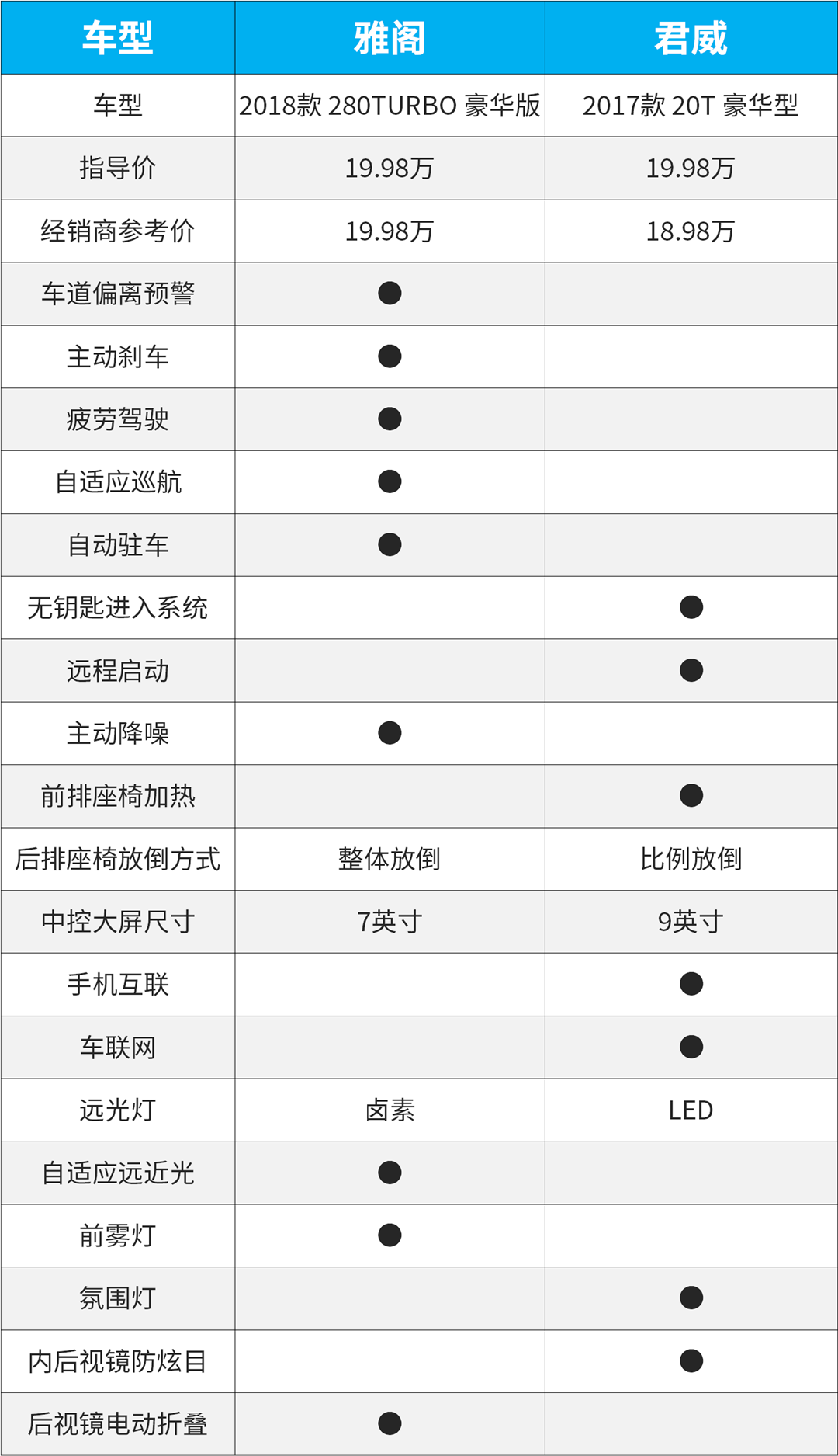 选取两者指导价同为19.98万的车型进行对比,不难看出配备车道偏离预警、主动刹车、疲劳驾驶的雅阁更注重安全性能的考量,尤其是疲劳驾驶提醒功能的加入将从源头上杜绝疲劳驾驶的产生,反观君威更大中控尺寸、车联网、手机互联的配置更贴近时下年轻化的潮流,综合后期优惠,究竟应该多花1万确保行车的安全性还是省点预算追求潮流?