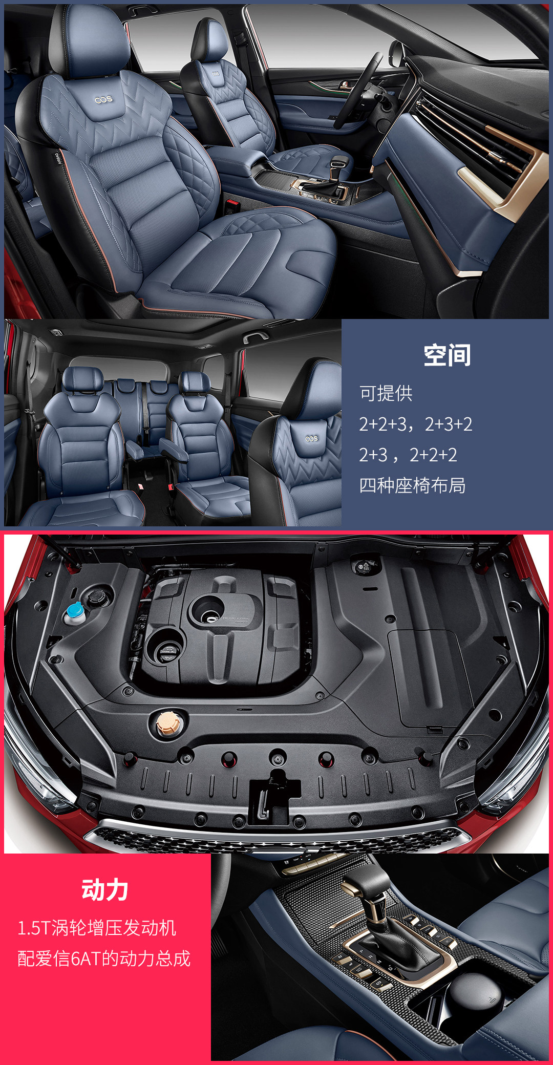 空间布局是科赛比较具有特点的一项产品亮点,具有5座/6座/7座三种座椅类型,却有四种座椅方式,其中七座布局有常见的2+3+2的SUV布局,也有类似MPV车型的2+2+3的座椅布局,基本上涵盖了市面上所有常见车型的座位分布方式。