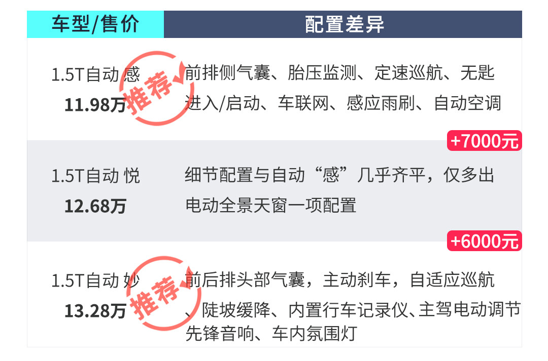 科赛的“悦”版本是比“感”高一个层级的车型;主要针对的是对于天窗有着一定追求的消费者,但由于自动挡“悦”版本比“感”多出7000元人民币在配置上除了多了个电动全景天窗之外并无其他本质上的区别,因此建议非必要的情况下不必考虑科赛的“悦”版本。