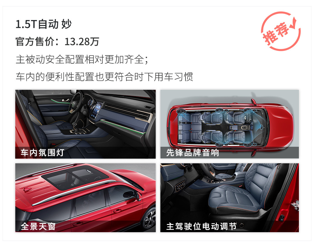 顶配“智”版本无疑会是科赛全系的配置天花板,诸如座椅通风加热、副驾驶电动调节、LED光源大灯、自动雨刷等配置都配备齐全,但价格也已经过了14.5万,因此在编者看来,可推荐指数并不高,属于高配置党的专属选择。
