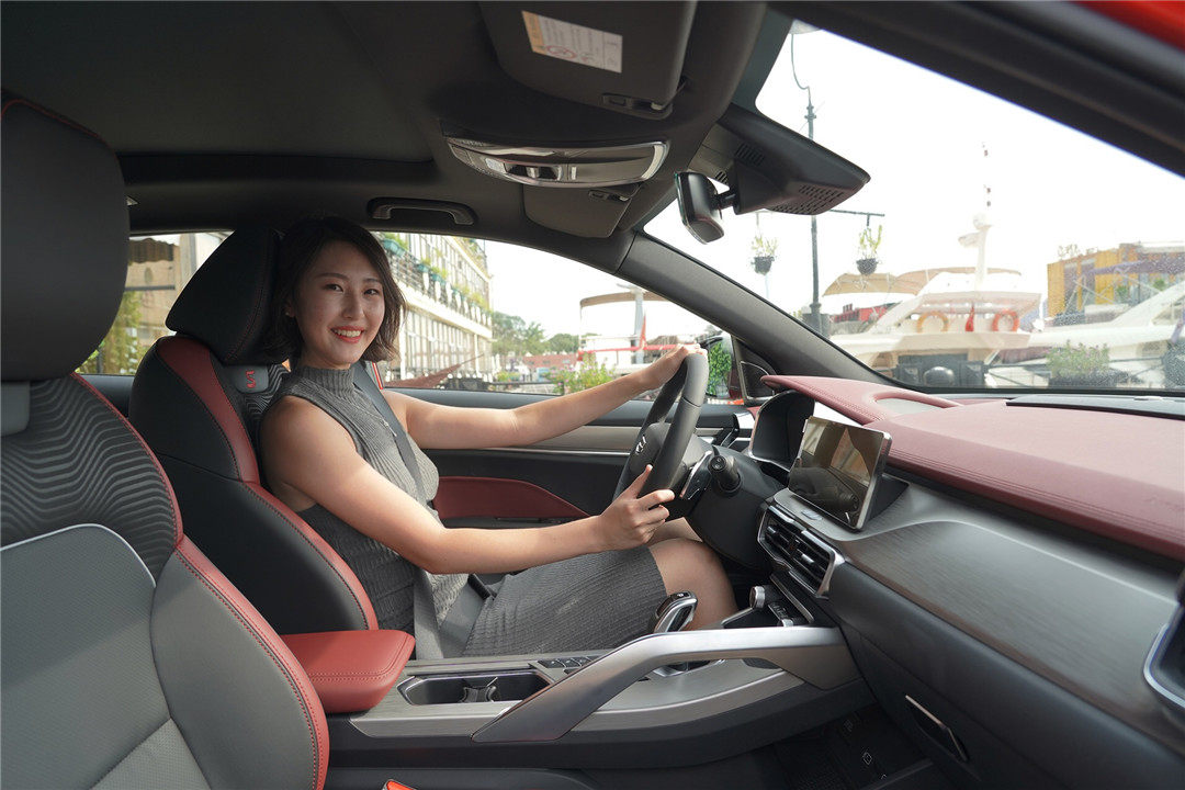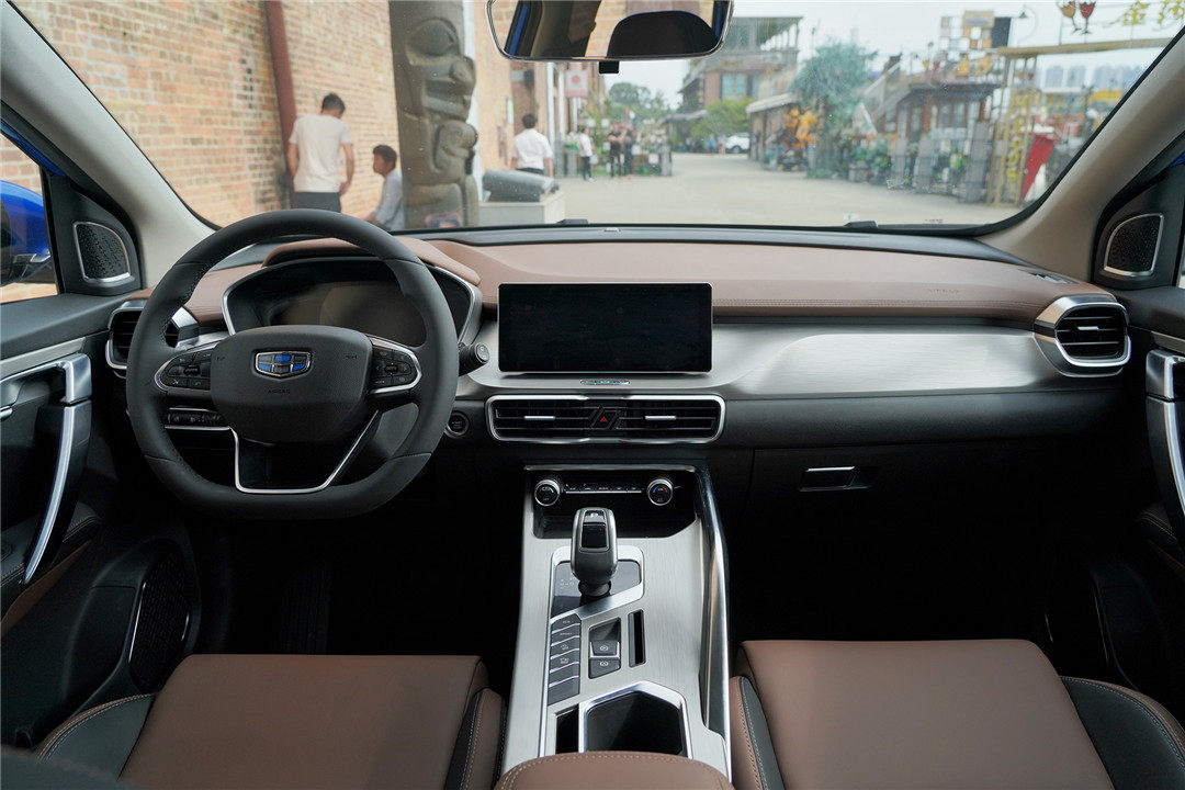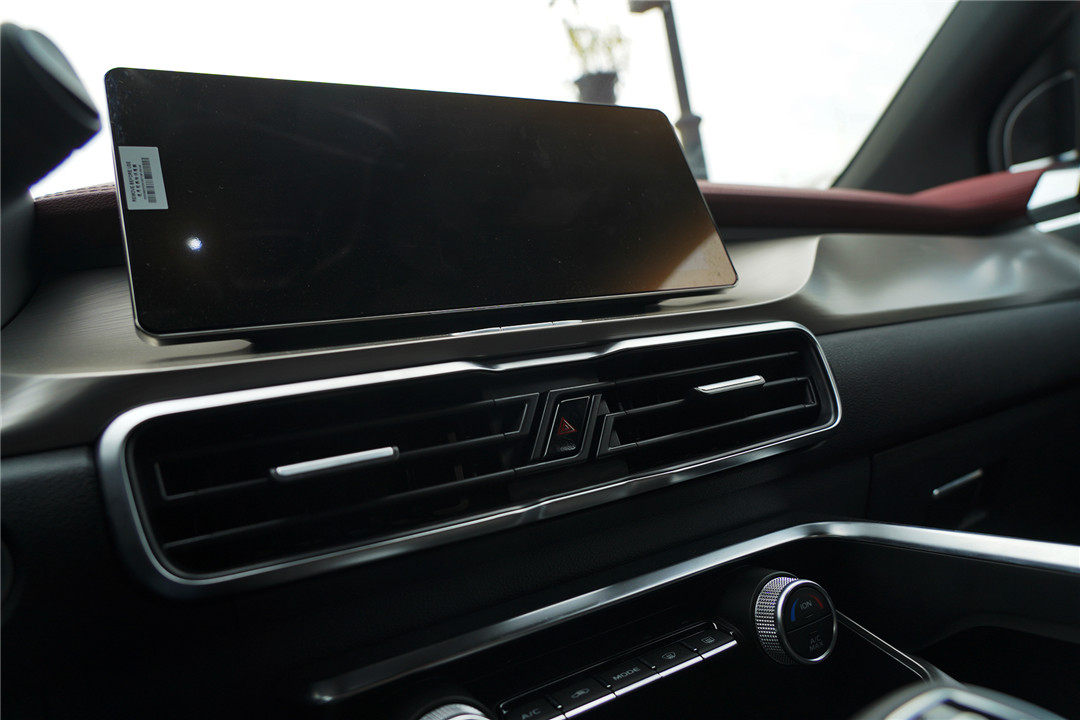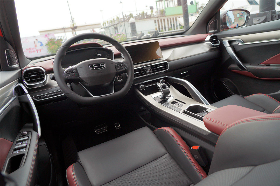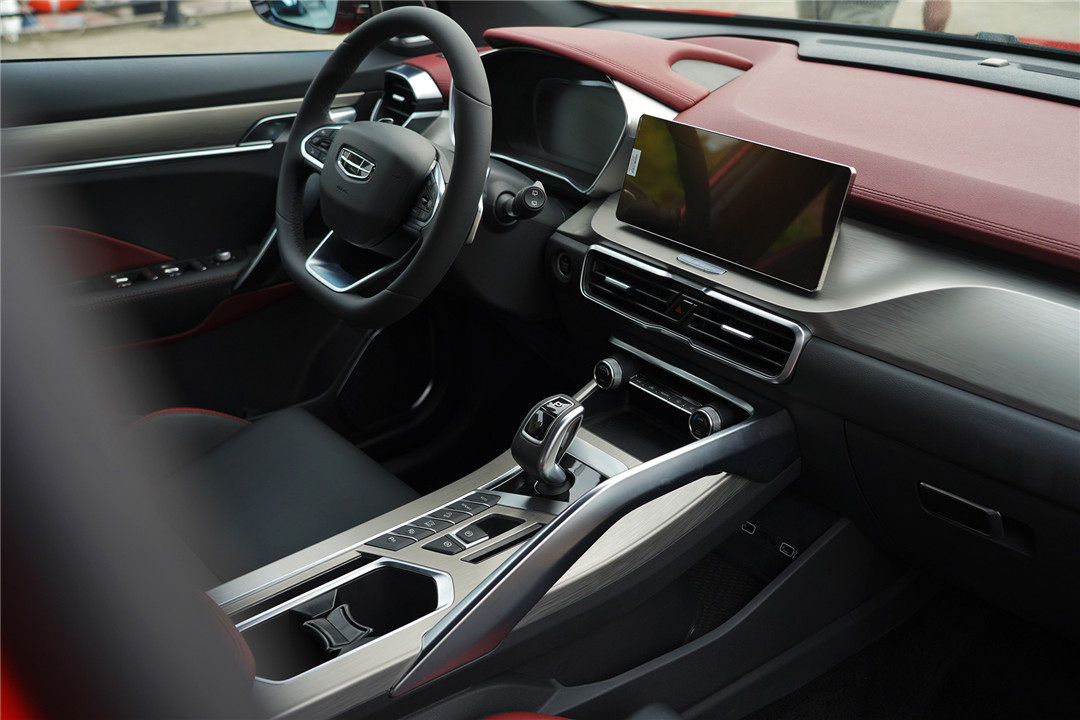 除了设计更符合时代特征之余,令我印象深刻的就是内饰整体质感的提升,吉利缤越整体采用了黑色搭配暗红色的撞色设计,并在多处细节加入了哑光金属拉丝元素进行点缀,让新车整体质感的到不错的提升。