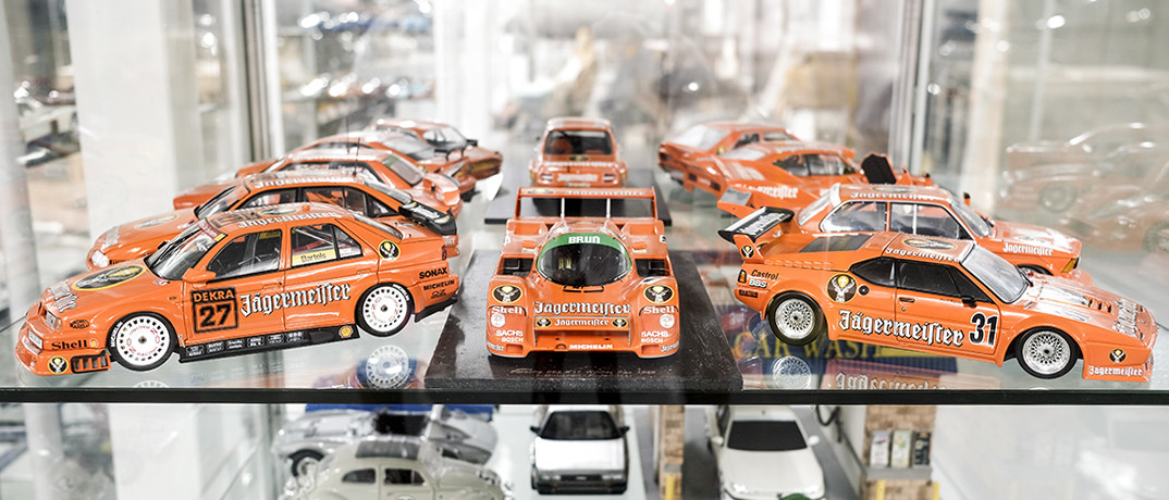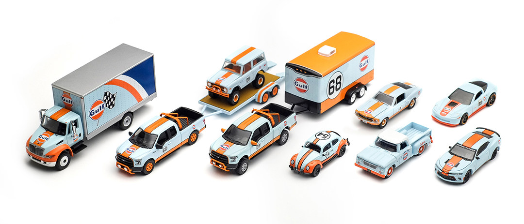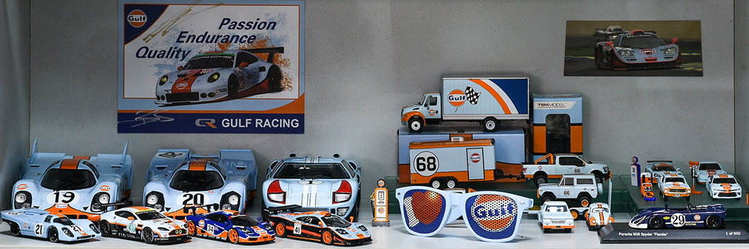 经典的赛车涂装系列也是颇受欢迎的模型车收藏方式,比如图中德国的Jagermeister啤酒涂装以及Gulf海湾石油涂装。